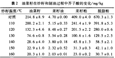 油菜籽中芥子酸的變化見表2。隨著炒籽溫度的升高,菜籽油中的芥子酸含量先增加后減少,在120℃時(shí)達(dá)到最大值,比對(duì)照增加80.4%。而油菜籽、菜籽粕和脫脂粕中的芥子酸含量均逐漸下降,在160℃時(shí),分別下降了90.5%、94.4%、95.4%。這可能是因?yàn)槲锪蠝囟壬?,芥子酸發(fā)生熱脫羧反應(yīng)生成Canolol,因此芥子酸含量隨炒籽溫度的升高而降低。