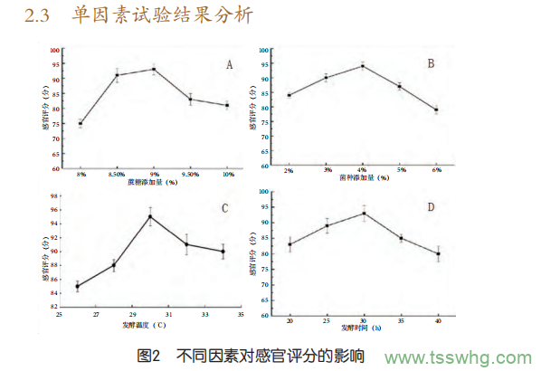 在發(fā)酵過程中,糖添加量、菌種添加量、發(fā)酵溫度和發(fā)酵時(shí)間均對發(fā)酵乳感官評分影響較大。用牦牛奶與荷斯坦牛奶比例為2:1進(jìn)行單因素試驗(yàn),結(jié)果如圖2所示: