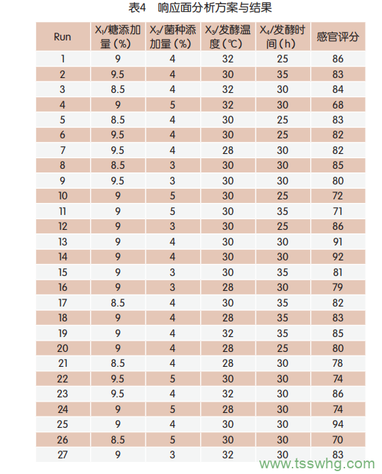 根據(jù)單因素試驗(yàn)的結(jié)果,建立Box-BehnkenDesign中心組合設(shè)計(jì)試驗(yàn)?zāi)P?,通過擬合二次方程計(jì)算最佳工藝組合,選取糖添加量、菌種添加量、發(fā)酵溫度、發(fā)酵時(shí)間進(jìn)行4因素3水平響應(yīng)面分析,結(jié)果見表4。