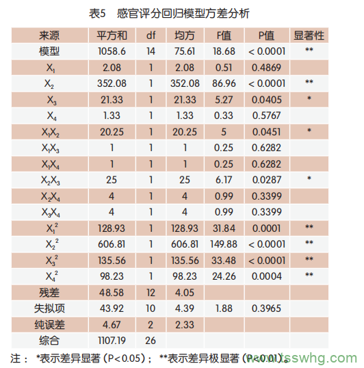 利用Design-Expert8.0.6軟件對表4進(jìn)行多元回歸擬合,得到糖的添加量(X1)、菌種添加量(X2)、發(fā)酵溫度(X 3)、發(fā)酵時(shí)間(X 4)的二次方程為Y=92.33+0.42X1-5.42X2+1.33X3-0.33X4+2.25X1X2-0.50X1X3+0.50X1X4-2.50X2X3+1.00X2X4-1.00X3X4-4.92X12-10.67X22-5.04X32-4.29X42?;貧w模型方差分析見表5。