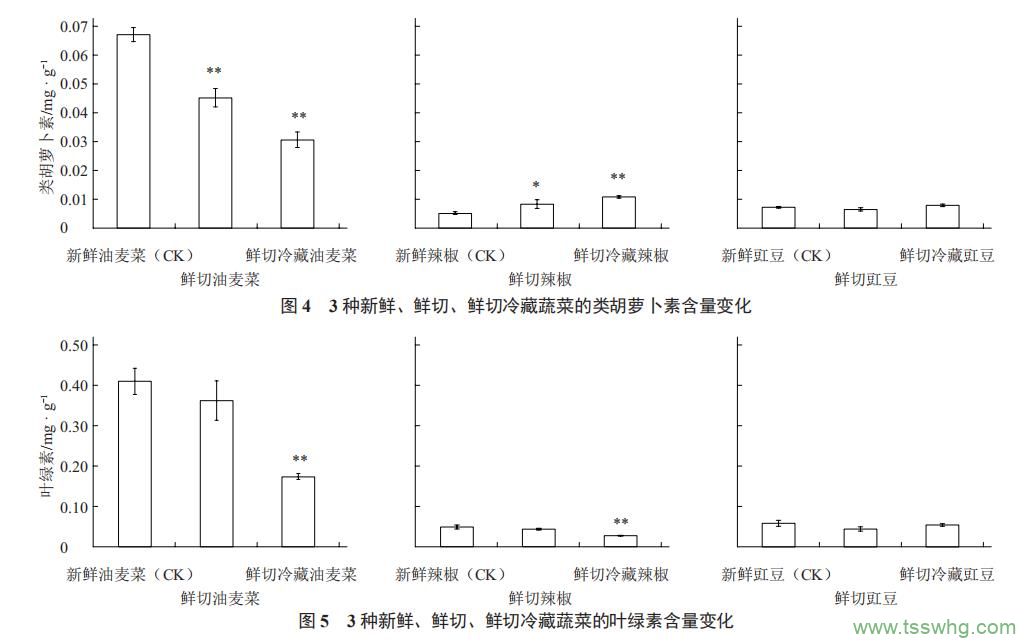 2.2鮮切和鮮切冷藏對(duì)4種蔬菜類胡蘿卜素和葉綠素含量的影響