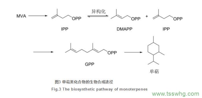 白芍為毛茛科植物芍藥Paeonia lactiflora Pall.的干燥根。有文獻(xiàn)報(bào)道白芍的化學(xué)成分主要有單萜及其苷類、三萜類、黃酮、鞣質(zhì)、多糖、揮發(fā)油等,其中單萜類成分芍藥苷含量較高且藥理活性較強(qiáng)。萜類成分主要通過甲戊二羥酸途徑合成,單萜類成分經(jīng)甲戊二羥酸(MVA)數(shù)步反應(yīng)轉(zhuǎn)化成異戊烯焦磷酸(IPP),IPP異構(gòu)化變成了二甲丙烯焦磷酸(DMAPP),IPP和DMAPP頭尾縮合得到焦磷酸香葉酯(GPP),GPP可反應(yīng)生成單萜類化合物,生物合成途徑見圖3。
