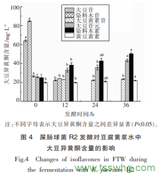 新鮮豆腐黃漿水經(jīng)過(guò)屎腸球菌R2的發(fā)酵作用后,其大豆異黃酮組分的存在形式及含量都發(fā)生了變化。結(jié)果表明,隨著發(fā)酵時(shí)間的延長(zhǎng),糖苷型大豆異黃酮含量逐漸降低,苷元型大豆異黃酮含量明顯升高,這表明屎腸球菌R2能夠促進(jìn)糖苷型大豆異黃酮向苷元型大豆異黃酮轉(zhuǎn)化。發(fā)酵36h后,低活性糖苷型異黃酮含量顯著減少(P<0.05),其含量下降到23.40mg/L;其中大豆苷和染料木苷在發(fā)酵24h后含量為零,全部轉(zhuǎn)化,而大豆黃素苷的含量變化相對(duì)較?。煌瑫r(shí),游離型苷元異黃酮的含量顯著增加(P<0.05),由70.05mg/L增加到115.21mg/L;其中大豆苷元含量由25.43mg/L增加至43.17mg/L,染料木素含量由24.90mg/L增加至50.16mg/L,黃豆黃素含量由19.72mg/L增加至21.88mg/L。