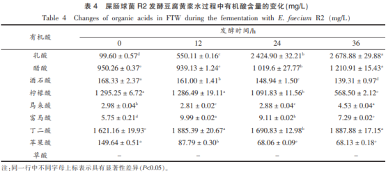 表4顯示了屎腸球菌R2發(fā)酵豆腐黃漿水過(guò)程中乳酸、醋酸、酒石酸等9種有機(jī)酸的變化。結(jié)果表明,在新鮮豆腐黃漿水中丁二酸含量最高,檸檬酸含量次之,接下來(lái)為醋酸、酒石酸、蘋果酸和乳酸,馬來(lái)酸和富馬酸含量很低,草酸含量最低,未檢出。