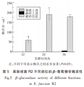 研究表明乳酸菌在發(fā)酵過(guò)程中可促進(jìn)豆腐黃漿中糖苷型大豆異黃酮向游離苷元型大豆異黃酮轉(zhuǎn)化,這主要是β-葡萄糖苷酶的酶解作用。對(duì)屎腸球菌R2發(fā)酵過(guò)程中不同部位的β-葡萄糖苷酶酶活進(jìn)行測(cè)定,結(jié)果如圖5所示,可知屎腸球菌R2具有β-葡萄糖苷酶酶活,且不同部位的酶活具有顯著差異(P<0.05)。菌體上清中的β-葡萄糖苷酶酶活幾乎為零,破碎沉淀酶活顯著高于破碎上清酶活,說(shuō)明屎腸球菌R2的β-葡萄糖苷酶屬于胞內(nèi)酶,且主要以不可溶性蛋白形式為主。這一結(jié)果與張哲的研究一致,其研究發(fā)現(xiàn)植物乳桿菌的β-葡萄糖苷酶為胞內(nèi)酶,主要為處于細(xì)胞膜上的不可溶性酶,還有少量存在于原生質(zhì)體內(nèi)細(xì)胞液中的可溶性酶。由圖5可以看出,隨著發(fā)酵時(shí)間的延長(zhǎng),β-葡萄糖苷酶的酶活先增加后稍有下降,在發(fā)酵24h時(shí)達(dá)到最大。