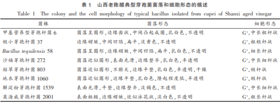 經(jīng)形態(tài)學觀察和16SrDNA測序比對,共分離得到54株芽孢菌。由圖1可知,54株芽孢菌中有17株解淀粉芽孢桿菌,14株枯草芽孢桿菌,11株地衣芽孢桿菌,1株莫海威芽孢桿菌,2株短小芽孢桿菌、甲基營養(yǎng)型芽孢桿菌、龍舌蘭桿菌和沙福芽孢桿菌,其中解淀粉芽孢桿菌、枯草芽孢桿菌和地衣芽孢桿菌均為山西老陳醋醋酸發(fā)酵階段的優(yōu)勢芽孢菌,分別占芽孢菌的31.36%,26.26%,20.59%。通過構(gòu)建系統(tǒng)進化樹(圖2)可知,解淀粉芽孢桿菌和枯草芽孢桿菌、甲基營養(yǎng)型芽孢桿菌的親源性關系較近,而與地衣芽孢桿菌的親源性關系更近,達99%,另外,短小芽孢桿菌、沙福芽孢桿菌聚類在另一個分支。典型芽孢菌的菌落形態(tài)和細胞形態(tài)描述見表1。