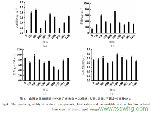 從醋醅中分離純化得到54株芽孢菌菌株,測定芽孢菌發(fā)酵液的乙偶姻、多酚、總酯、不揮發(fā)性酸能力。各能力均較高的10株芽孢菌的乙偶姻、多酚、總酯、不揮發(fā)性酸含量如圖4所示,其中枯草芽孢桿菌803產(chǎn)乙偶姻、總酯含量最高,解淀粉芽孢桿菌1539產(chǎn)多酚、不揮發(fā)酸含量最高。
