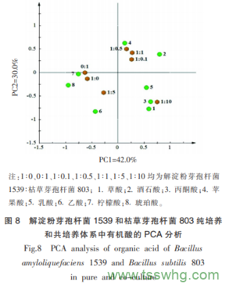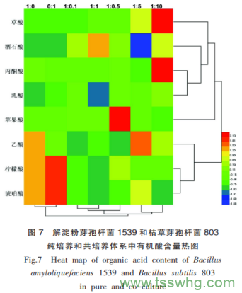 有機(jī)酸是山西老陳醋總酸中的重要成分,可以緩和陳醋的刺激性,使酸味柔和。以解淀粉芽孢桿菌1539和枯草芽孢桿菌803純培養(yǎng)為對照,研究共培養(yǎng)相互作用對芽孢菌有機(jī)酸含量的影響。由圖7、圖8可知,解淀粉芽孢桿菌1539和枯草芽孢桿菌803在純培養(yǎng)(1:0和0:1,V/V)時,二者的有機(jī)酸譜相似,檸檬酸和琥珀酸含量最高;在共培養(yǎng)時,二者比例為1:0.1,1:0.5,1:1(V/V)的有機(jī)酸譜相似。解淀粉芽孢桿菌1539和枯草芽孢桿菌803為1:0.5(V/V)共培養(yǎng)時的蘋果酸含量最高;二者比例為1:10(V/V)共培養(yǎng)時,草酸、丙酮酸、酒石酸、乳酸的含量都顯著升高,分別比純培養(yǎng)(1:0,V/V)時提高89.78%,88.32%,22.92%,32.98%,它們可以緩沖乙酸帶來的刺激酸味,使醋的口感變得柔和,其中丙酮酸具有愉快的香味和帶有微辣的甜味,可豐富陳醋的口感;乳酸與醇類物質(zhì)酯化生成脂類物質(zhì),如乳酸乙酯,可以很好地改善陳醋的風(fēng)味。