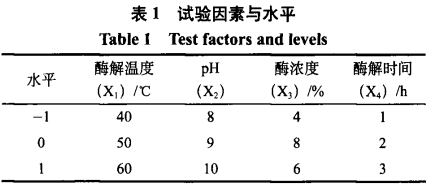 通過單因素實(shí)驗(yàn)的結(jié)果,可以篩選出各因素的三個(gè)水平。所以在此基礎(chǔ)之上,應(yīng)用統(tǒng)計(jì)分析軟件建立4因素3水平的Box—Behnken模型,進(jìn)行回應(yīng)面優(yōu)化設(shè)計(jì)。因素和水平取值如表1所示。