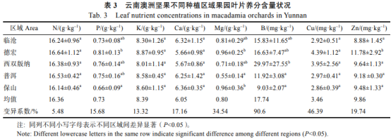 由表3可知,云南澳洲堅(jiān)果種植區(qū)堅(jiān)果葉片氮(16.14~16.64g/kg)和鉀(8.01~8.87g/kg)養(yǎng)分含量以德宏最高,但各種植區(qū)之間無(wú)顯著差異。葉片磷養(yǎng)分含量(0.66~0.81g/kg)德宏(最高)與保山(最低)具有顯著差異外,其他種植區(qū)無(wú)顯著差異。鈣養(yǎng)分含量(5.66~6.36g/kg)保山(最高),德宏(最低),且各種植區(qū)無(wú)顯著差異。鎂養(yǎng)分含量(0.55~0.96mg/kg)德宏和保山(最高)與普洱(最低)具有顯著差異,與其他種植區(qū)無(wú)顯著差異。硼養(yǎng)分含量西雙版納最高(29.97mg/kg)而保山與普洱較低(9.03~11.92mg/kg),前一個(gè)種植區(qū)與后2個(gè)種植區(qū)之間存在顯著差異。銅養(yǎng)分含量(2.86~4.39mg/kg)德宏最高而保山最低,鋅養(yǎng)分含量(8.88~11.78mg/kg)德宏最高而臨滄最低,銅鋅養(yǎng)分含量在5個(gè)種植區(qū)之間均無(wú)顯著差異。云南主要澳洲堅(jiān)果種植區(qū)葉片氮、磷、鉀、鈣、鎂、硼、銅和鋅養(yǎng)分平均含量分別為:16.36g/kg、0.73g/kg、8.39g/kg、6.05g/kg、0.80g/kg、17.74mg/kg、3.46mg/kg和9.86mg/kg;不同種植區(qū)葉片硼和銅變異系數(shù)較大,為90.60%、46.39%。