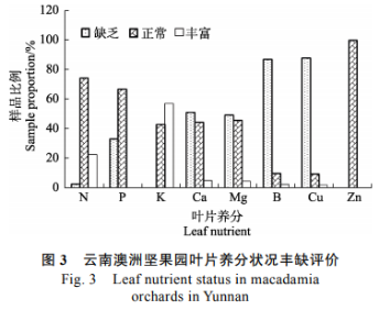 根據(jù)澳大利亞澳洲堅(jiān)果葉片中的養(yǎng)分分級(jí)標(biāo)準(zhǔn)與營(yíng)養(yǎng)元素狀況等,對(duì)云南澳洲堅(jiān)果葉片營(yíng)養(yǎng)進(jìn)行養(yǎng)分豐缺狀況評(píng)價(jià)。葉片營(yíng)養(yǎng)診斷處于適宜的參考指標(biāo)如下:氮14~17g/kg,磷0.7~1.0g/kg,鉀4.0~8.0g/kg,鈣6.0~9.0g/kg,鎂0.8~1.2g/kg,硼40~80mg/kg,銅5~10mg/kg,鋅6~15mg/kg。經(jīng)對(duì)表2中所包含的47個(gè)云南澳洲堅(jiān)果園葉片養(yǎng)分測(cè)定數(shù)據(jù)計(jì)算可知(圖3),葉片N養(yǎng)分含量處于適宜和豐富狀況的樣品比例占74%和23%;葉片P養(yǎng)分含量處于適宜和低于缺乏狀況的樣品比例占67%和33%;葉片K養(yǎng)分含量處于適宜和豐富狀況的樣品比例占43%和57%;葉片Ca養(yǎng)分含量處于適宜和缺乏狀況的樣品比例占44%和51%;葉片Mg養(yǎng)分含量處適宜和缺乏狀況的樣品比例占46%和49%;葉片B養(yǎng)分含量缺乏和適宜(含豐富)的樣品比例占87%和13%;銅養(yǎng)分含量缺乏和適宜(含豐富)的樣品比例占88%和12%;Zn養(yǎng)分含量處于適宜的樣品比例占100%(圖3)。從以上分析可得出云南澳洲堅(jiān)果園葉片N、P、K和Zn養(yǎng)分處于適宜或豐富狀況;Ca和Mg養(yǎng)分處于缺乏或適宜狀況;而B(niǎo)和Cu養(yǎng)分處于缺乏狀況。