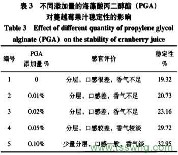 (3)海藻酸丙二醇酯(PGA)對蔓越莓果汁穩(wěn)定性的影響