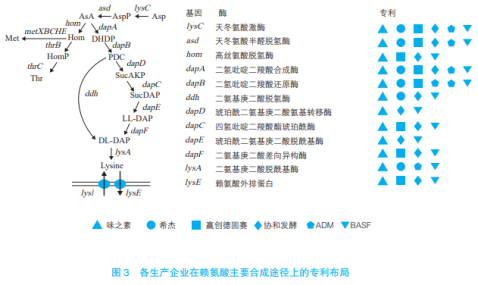 早在20世紀90年代,味之素公司便開始了大腸桿菌產(chǎn)賴氨酸的專利申請和保護,隨著研發(fā)的不斷深入,其專利申請量也不斷增加,2000年左右其已經(jīng)對賴氨酸主要合成途徑的技術形成了全面的保護。協(xié)和發(fā)酵、贏創(chuàng)德固賽、希杰公司也都在谷氨酸棒桿菌產(chǎn)賴氨酸方面進行了大量的專利申請和布局,部分如圖3所示。同時,由于歷史原因,早期菌種改造專利獲得授權的保護范圍極大,例如,味之素公司在專利WO2005010175中保護了含有不能正常發(fā)揮功能的蘋果酸酶的埃希氏菌生產(chǎn)L-賴氨酸的方法,其中對不能正常發(fā)揮功能的描述既包括了功能被去除、也包括減弱,而且所述的蘋果酸酶序列擴大到了大腸桿菌來源的sfcA或b2463基因編碼的蛋白序列通過取代、缺失、插入或添加一個或數(shù)個(2~20個)氨基酸殘基衍生的蘋果酸酶,該同族專利在中國、美國、歐洲都獲得了授權。由于國際大公司已有專利對賴氨酸合成途徑的主要代謝步驟都進行了全方位的保護,這對后來者開發(fā)提升相關菌種制造了極大的專利壁壘,使得后來者侵犯專利的風險顯著提高,突破專利封鎖的空間被進一步壓縮。
