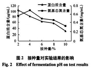 如圖1所示,在發(fā)酵時(shí)間和接種量一定的基礎(chǔ)上,當(dāng)牡蠣培養(yǎng)基的pH為5~7時(shí),氨基態(tài)氮的含量呈上升趨勢(shì),在pH為7時(shí)氨基態(tài)氮的含量達(dá)到了最高值,pH為7~8時(shí)氨基態(tài)氮含量稍有下降,pH為8~9時(shí)下降較為明顯,這可能是因?yàn)榧{豆芽孢桿菌生長(zhǎng)的最適pH為7,而且納豆激酶在pH為7時(shí)納豆激酶活力最高。蛋白質(zhì)含量在pH為5~7時(shí)呈下降趨勢(shì),從pH7~9則呈上升趨勢(shì)。可能與納豆芽孢桿菌產(chǎn)酶活力下降有關(guān)。