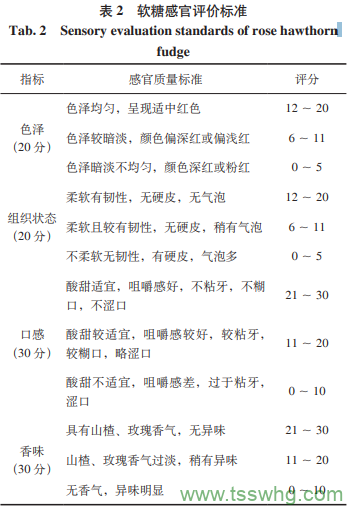 邀請10名食品專業(yè)人員組成感官評定小組。按表2軟糖感官評分標準對軟糖的色澤、組織狀態(tài)、口感、香味進行評分,取10組評定結(jié)果的平均值。
