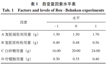 經(jīng)過預(yù)實驗確定:當復配原料粉比例(玫瑰花粉∶山楂粉)為3∶2時,成品軟糖色澤呈現(xiàn)較為適宜的紅色,玫瑰花與山楂風味綜合表現(xiàn)良好;復配凝膠劑比例(瓊脂∶卡拉膠)為2∶3時,軟糖具有良好的透明度、韌性和柔軟度。在固定復配凝膠劑比例(瓊脂∶卡拉膠=2∶3)、復配原料粉比例(玫瑰粉∶山楂粉=3∶2)的基礎(chǔ)上,研究復配凝膠劑添加量、復配原料粉用量、白砂糖用量、檸檬酸用量對軟糖品質(zhì)的影響。采用Box-Behnken模型,對以上4個影響因素進行響應(yīng)面設(shè)計,響應(yīng)面分析因子及水平見表1。