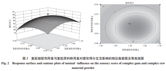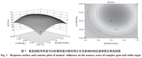 在固定復(fù)配凝膠劑和復(fù)配原料粉比例的基礎(chǔ)上,應(yīng)用Design-Expert8.0.6.1軟件對復(fù)配凝膠劑用量、復(fù)配原料粉用量、白砂糖用量、檸檬酸用量4個影響因素進行Box-Behnken設(shè)計并分析,得到玫瑰山楂軟糖最佳配方為:復(fù)配凝膠劑(瓊脂∶卡拉膠=2∶3)用量1.53g,復(fù)配原料粉(玫瑰粉∶山楂粉=3∶2)用量0.46g,白砂糖用量21.48g,檸檬酸用量0.36g。