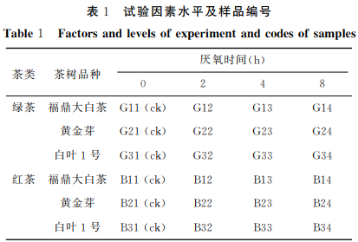 鮮葉進(jìn)行常規(guī)攤放4h后,以不同厭氧時間分別結(jié)合綠茶和紅茶工藝進(jìn)行制樣。厭氧處理方式為稱取鮮葉300g于食品真空包裝袋中,采用食品真空封口機(jī)抽真空封口包裝,置于室內(nèi)進(jìn)行常溫厭氧處理。綠茶具體工藝步驟為:鮮葉攤放→厭氧(時間分別為0、2、4、8h)→殺青(投葉量300g,鍋溫180℃,時間2min)→80℃干燥至足干;紅茶具體工藝步驟為:鮮葉攤放→揉捻30min→厭氧(時間分別為0、2、4、8h)→發(fā)酵(時間為4h,發(fā)酵溫度為28℃,濕度保持為90%)→80℃干燥至足干。試驗(yàn)因素水平及樣品編號見表1。
