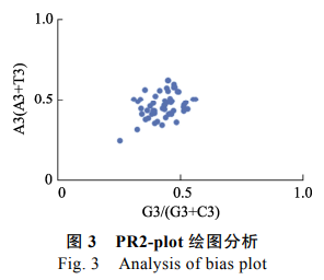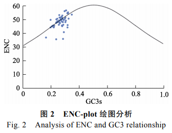 PR2-plot繪圖通過(guò)分析密碼子第3位堿基的組成關(guān)系,揭示密碼子使用偏好性的影響因素。由圖3可以看出芒果基因在4個(gè)區(qū)域內(nèi)分布不均勻,多數(shù)分布于平面圖的左下方。T和C在密碼子第3位出現(xiàn)的頻率較高,G與C、A與T的使用頻率不相等,T的使用頻率高于A,C的使用頻率高于G,嘧啶的使用頻率高于嘌呤,說(shuō)明突變不是影響芒果密碼子使用偏好性的唯一因素,選擇等其他因素對(duì)芒果密碼子使用偏好性也產(chǎn)生一定的影響。