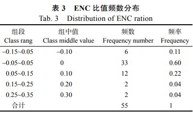 ENC-plot繪圖以ENC比值[(預(yù)期ENC值~實(shí)際ENC值)/預(yù)期ENC值]和ENC比值頻數(shù)判斷偏好性影響因素,揭示ENC與GC3s的關(guān)系,反映堿基組對(duì)密碼子偏好性的影響程度?;蜃鴺?biāo)點(diǎn)離標(biāo)準(zhǔn)曲線的距離近且數(shù)量較多說(shuō)明偏好性主要受到突變的影響;反之說(shuō)明偏好性受選擇的影響較大。圖2結(jié)合表3顯示60%共33個(gè)基因分布在–0.05~0.05之間,這33個(gè)基因的實(shí)際ENC值與預(yù)期ENC值接近,與標(biāo)準(zhǔn)曲線的距離較近,分布在–0.05~0.05之外的基因有22個(gè),這22個(gè)基因與預(yù)期ENC值較遠(yuǎn),在標(biāo)準(zhǔn)曲線較遠(yuǎn)的位置。說(shuō)明芒果基因組密碼子偏好性與GC3的差異有關(guān),突變對(duì)芒果葉綠體基因組密碼子偏好性的影響較大。