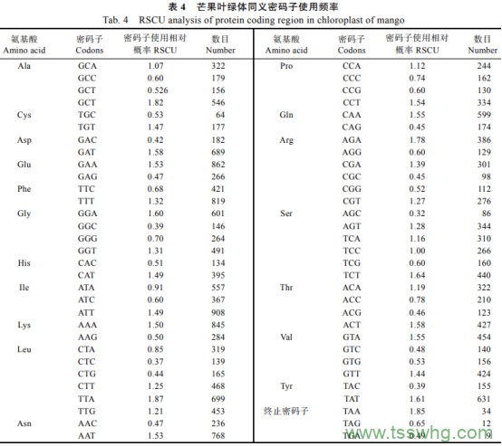 利用codonW軟件對(duì)芒果55條基因序列的RSCU值進(jìn)行計(jì)算(表4)。結(jié)果顯示RSCU>1的密碼子共31個(gè),出現(xiàn)頻率相對(duì)較高的是以A(13個(gè))或T(16個(gè))結(jié)尾的密碼子,是芒果基因組偏愛(ài);以G(1個(gè))或C(1個(gè))結(jié)尾的密碼子出現(xiàn)的頻率較低且RSCU值多小于1,說(shuō)明這些是基因組非偏好的密碼子。