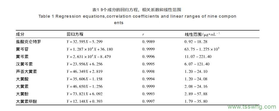 精密吸取“1.2.2”項下混合對照品溶液0.5、1、2、5、8、10mL,分別置10mL量瓶中,加甲醇稀釋并定容,制得系列濃度對照溶液。分別進樣測定,記錄峰面積,以對照品濃度為橫坐標、峰面積為縱坐標進行線性回歸,得回歸方程,線性范圍及相關系數(表1)。
