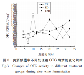 前期研究發(fā)現(xiàn),OTC與EC的形成呈負(fù)相關(guān)性,即OTC的表達(dá)對(duì)EC的形成有抑制作用,而OTC與EC的直接關(guān)聯(lián)性并未見任何報(bào)道。因此,本試驗(yàn)分別在黃酒發(fā)酵的前期(發(fā)酵第5天)和中期(發(fā)酵第12天),添加相同濃度純化后的OTC酶,以驗(yàn)證其與EC形成的直接相關(guān)性。如圖1所示,在發(fā)酵開始直至第12天,試驗(yàn)組EC含量均顯著高于對(duì)照組,而在12d之后,試驗(yàn)組12D的EC含量表現(xiàn)出明顯的下降趨勢(shì),直至發(fā)酵結(jié)束。而在發(fā)酵前期添加OTC酶的試驗(yàn)組5D則顯著提高了EC含量,出現(xiàn)這一變化趨勢(shì)的原因還有待進(jìn)一步研究。總體而言,在恰當(dāng)?shù)陌l(fā)酵階段,如發(fā)酵的中期,OTC酶的添加對(duì)EC形成確有抑制作用,然而若添加時(shí)間不合適,則有可能促進(jìn)EC的形成代謝。