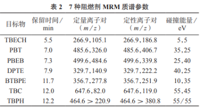 電離源:EI;電子能量:70eV;離子源溫度:230℃;四級桿溫度:150℃;溶劑延遲時間:2min;多反應監(jiān)測模式:MRM模式,7種阻燃劑的MRM質譜參數(shù)見表2。