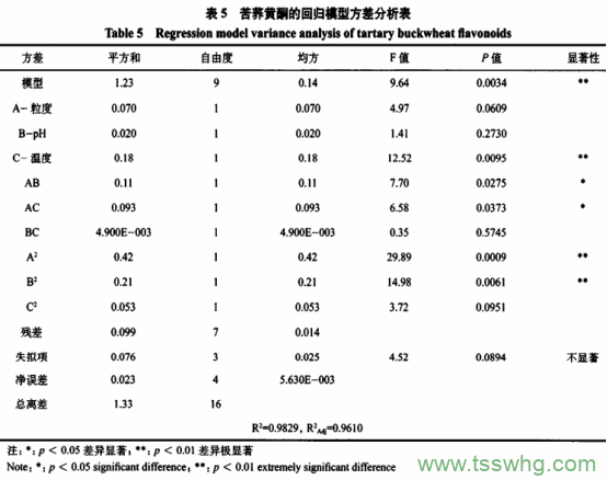 由方差分析可知,回歸模型極顯著(p<0.0001),提取苦蕎蛋白方程失擬項(xiàng)為0.5607>0.05;提取黃酮的失擬項(xiàng)為0.0894>0.05,二者都表明失擬項(xiàng)不顯著,且苦養(yǎng)蛋白的R2=0.9845,R2Adi=0.9646; 黃酮的R2=0.9829,R2Adi=0.9610,表明該模型與實(shí)際值擬合性很好,可以利用二者的回歸方程確定苦蕎蛋白和黃酮類物質(zhì)的最佳提取工藝條件。根據(jù)回歸模型的方差分析也表明對(duì)苦養(yǎng)蛋白影響極顯著的因素有A(粒度)、A2、B2、C2,影響顯著的因素有B(pH)、C(溫度),AB、AC、BC的交互影響均不顯著。對(duì)苦養(yǎng)黃酮類化合物影響極顯著的是C(溫度)、A2、B2,影響顯著的有AB、AC的交互作用,A(粒度)、B(pH)、BC、C2影響不顯著。從單因素水平分析可以得出,各個(gè)因素對(duì)苦蕎蛋白影響的主次順序?yàn)榱6龋緋H>溫度,對(duì)苦養(yǎng)黃酮影響的主次順序?yàn)闇囟龋玖6龋緋H。