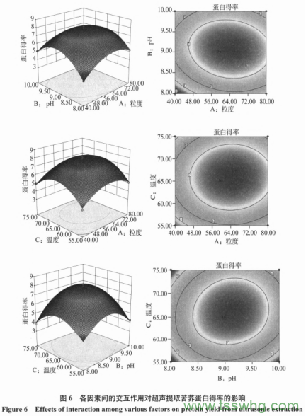 依照Box—Behnken中心組合設(shè)計(jì)原理和試驗(yàn)數(shù)據(jù)得出的各因素間的交互作用如圖6和圖7,根據(jù)圖6和圖7的響應(yīng)面圖及等高線圖能夠比較直觀地反應(yīng)各個(gè)因素之間的交互作用及其對(duì)響應(yīng)值的影響。從各因素之間交互的圖形可以看出各因素間交互作用的強(qiáng)弱,其中曲線走勢(shì)越陡說(shuō)明其影響越顯著;曲線走勢(shì)越平滑說(shuō)明其影響越小。提取苦蕎黃酮和蛋白的響應(yīng)面都存在極值,即響應(yīng)面有最高點(diǎn)峰值。通過分析可知,當(dāng)粉碎粒度為63.60目,pH為9.15,提取溫度為67.26℃,液料比為30∶1mL/g,超聲時(shí)間為40min時(shí)為超聲同步提取苦蕎蛋白和黃酮類化合物的最佳提取工藝條件?;貧w模型預(yù)測(cè)理論中蛋白得率為7.90%,黃酮得率為1.17%。對(duì)結(jié)果進(jìn)行驗(yàn)證性實(shí)驗(yàn),考慮到實(shí)際操作的可行性,將苦蕎蛋白和黃酮類化合物的最佳同步提取工藝條件修正為:液料比為30∶1mL/g,超聲時(shí)間為40min,粉碎粒度為60目,pH為9.15,提取溫度為67.2℃,在此條工藝條件下進(jìn)行超聲輔助苦蕎蛋白和黃酮的同步提取。