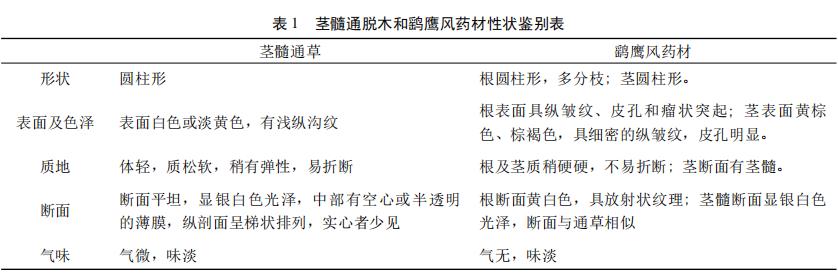 目前對(duì)鷂鷹風(fēng)的性狀描述已有記載,鷂鷹風(fēng)莖髓即通草和鷂鷹風(fēng)的藥材,從形狀、表面及色澤、質(zhì)地、斷面、氣味等進(jìn)行鑒別。見表1。但有報(bào)道,通草作為常用中藥混淆品居多,混淆品中有的莖髓空心、無空心或不明顯,泡水后有粘手現(xiàn)象等。而鷂鷹風(fēng)藥用部位是根和莖,相對(duì)于莖髓更易區(qū)別。