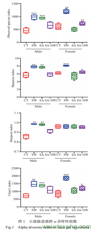 將實(shí)驗(yàn)小鼠按性別隨機(jī)分成4組,共8組,每組5只,標(biāo)記后稱重記錄初始體重。對(duì)照組(CT)每日灌胃生理鹽水(20g/kg/day),冬瓜組(SW)每日灌胃發(fā)酵冬瓜混合菌液(20g/kg/day),其中發(fā)酵冬瓜的灌胃量前期做了預(yù)實(shí)驗(yàn),發(fā)現(xiàn)對(duì)小鼠使用這個(gè)劑量能與感染金黃色葡萄球菌抗衡。金葡組(SA)每日灌胃金黃葡萄球菌液100μL,金葡+冬瓜處理組(SA+SW)每日灌胃金黃葡萄球菌液(10g/kg/day)和發(fā)酵冬瓜(10g/kg/day),連續(xù)給藥4周。每周測(cè)量體重。整個(gè)實(shí)驗(yàn)過程,小鼠自由攝食和飲水,控制室內(nèi)溫度(23±1℃)和濕度(55%±10%),循環(huán)12h光照/黑暗(燈光)。小鼠灌胃4周后收集糞便于-80℃冰箱備用。