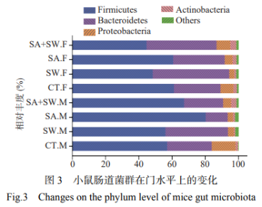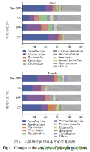SW組與CT組相比,雌性小鼠的厚壁菌門(Firmicutes)和變形菌門(Proteobacteria)相對豐度由61.09%和76.73%下降到48.35%和2.92%,擬桿菌門(Bacteroidetes)的相對豐度由28.02%增加到46.03%。SA組與CT組相比,雄性小鼠厚壁菌門相對豐度由57.01%上升到80.20%,擬桿菌門和變形菌門的相對豐度由26.78%和14.33%下降到13.21%和3.20%,雌性小鼠變形菌門的相對豐度也下降,從7.67%下降至4.76%。SA+SW組與CT組相比,雄性小鼠厚壁菌門相對豐度由57.01%上升到67.18%,變形菌門的相對豐度由14.33%下降4.84%,雌性小鼠厚壁菌門相對豐度由61.09%下降至44.59%,擬桿菌門相對豐度由28.02%上升到42.06%(圖3)。