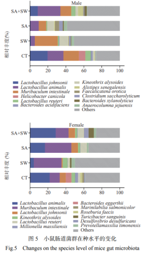 與CT組比較,雄性小鼠SW組的約氏乳桿菌(Lactobacillusjohnsonii)、動物乳桿菌(Lactobacillusanimalis)和羅伊氏乳桿菌(Lactobacillusreuteri)三種菌相對豐度分別從19.56%、17.59%、6.03%降低至0.79%、4.54%和1.3%,在SA組中分別降低至0.49%、9.21%、1.03%,而這三種菌在SA+SW組中與SA組相比相對豐度升高,其中動物乳桿菌升高至25.31%。與對照組相比,SW組的Muribaculumintestinale豐度從17.24%增加到25.49%,而SA組Muribaculumintestinale豐度從17.24%降至8.33%。Kineothrixalysoides、解糖梭菌(Clostridiumsaccharolyticum)在SA組相對豐度比其他組高。在雌性小鼠中,與CT組比較,SW組和SA組中的動物乳桿菌分別從21.77%下降至4.07%和16.58%,在SA+SW組中回升至28.53%;SW組、SA組、SA+SW組中Muribaculumintestinale相對豐度分別從11.29%上升至30.91%、29.43%和14.26%(圖5)。