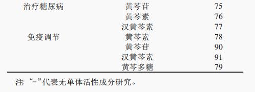 近年來(lái),對(duì)黃芩的化學(xué)成分和藥理作用的研究越來(lái)越廣泛,并取得一定進(jìn)展,其中的一些活性成分也被發(fā)現(xiàn)。根據(jù)文獻(xiàn)信息對(duì)黃芩的藥理作用及其物質(zhì)基礎(chǔ)進(jìn)行總結(jié)分析,見(jiàn)表2。從分析結(jié)果可以看出,黃芩中的黃酮類成分是黃芩的主要有效成分。