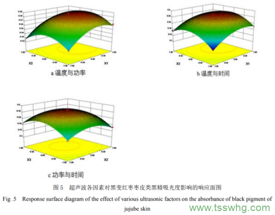 對(duì)上述回歸模型進(jìn)行分析(表3)發(fā)現(xiàn),得到的回歸模型顯著,失擬誤差不顯著,回歸決定系數(shù)R2為93.25%,修正決定系數(shù)R2Adj為98.28%,說(shuō)明響應(yīng)值的變化有93.93%來(lái)源于所選的因子變化,擬合度良好,說(shuō)明該回歸模型能夠較好的各因素與響應(yīng)值之間的關(guān)系,變異系數(shù)CV為0.06表示的是本試驗(yàn)的精度,其值越小表示模型的可靠性越好,因此利用此方程模型來(lái)確定超聲輔助提取類黑精的工藝參數(shù)是可行的。由回歸模型和方差分析可知,方程一次項(xiàng)X1和X3對(duì)黑變棗皮類黑精的吸光度的影響達(dá)到極顯著水平,交互項(xiàng)X1X3相對(duì)于其他交互項(xiàng)對(duì)黑變棗皮類黑精的吸光度影響更為顯著,二次項(xiàng)X12、X22、X32對(duì)黑變棗皮類黑精吸光度的影響均達(dá)到極顯著水平,根據(jù)F值可知,各個(gè)因素對(duì)黑變棗皮類黑精吸光度影響的大小的順序?yàn)椋篨1(超聲溫度)>X3(超聲功率)>X2(超聲時(shí)間)。