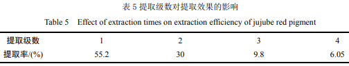 超聲波法最佳提取級(jí)數(shù)的確定在確定最佳提取工藝的條件下,多次的浸提一定量的黑變棗皮,按照在確定最佳提取條件的情況下,多次在最佳條件下浸提一定量黑變棗皮,直至最后浸提黑變棗皮溶液吸光度值小于0.02,分別收集各次類黑精浸提液同時(shí)測(cè)定其體積Vi和吸光度值A(chǔ)i,最后合并收集的浸提液總體積V和總吸光度值A(chǔ),計(jì)算各次提取率,確定提取級(jí)數(shù),中的方法計(jì)算出類黑精提取率,結(jié)果見表5。