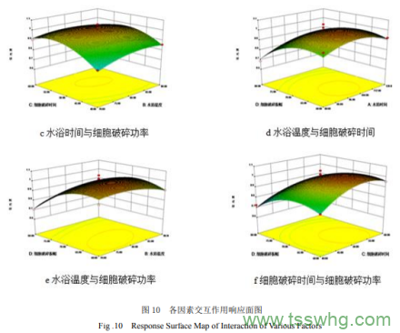各因素的交互作用對響應(yīng)值的影響如圖6所示,響應(yīng)面坡度越陡峭,表明響應(yīng)值對于操作條件的改變越敏感,該因素對黑變紅棗棗皮類黑精吸光度值影響越大;反之則表明因素對吸光度的影響越小。等高線圖反映了存在極值的條件在圓心處。在交互項對吸光度的影響中,水浴溫度和細(xì)胞破碎時間交互作用明顯,其他因素之間交互作用不明顯,這與方差分析的結(jié)果一致。