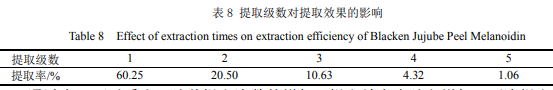 在確定最佳提取工藝的條件下,多次的浸提一定量的黑變棗皮,按照在確定最佳提取條件的情況下,多次在最佳條件下浸提一定量黑變棗皮,直至最后浸提黑變棗皮溶液吸光度值小于0.02,分別收集各次類黑精浸提液同時測定其體積Vi和吸光度值A(chǔ)i,最后合并收集的浸提液總體積V和總吸光度值A(chǔ),計算各次提取率,確定提取級數(shù)中的方法計算出類黑精提取率,結(jié)果見表8。
