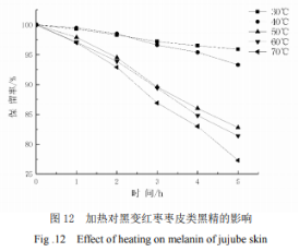 由圖12可以看出,隨著加熱溫度的升高,時間的延長,黑變紅棗棗皮類黑精的保留率都呈現(xiàn)了了逐漸下降的趨勢,當(dāng)加熱溫度為30℃、40℃時,其類黑精吸光度保留率下降幅度不大,5小時后分別穩(wěn)定在了95.7%和95.3%,當(dāng)加熱溫度為40℃-70℃時,黑變紅棗棗皮類黑精的保留率有了比較明顯的下降,其保留率值都跌破了20%左右,因此,黑變紅棗棗皮類黑精的熱穩(wěn)定性較差,在較高溫度時易分解。