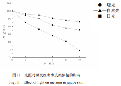 由圖11可以看出,隨著光照時間的延長,在三種光照條件下黑變紅棗棗皮類黑精的穩(wěn)定性都是逐漸下降的,其中日光直射的條件下對黑變紅棗棗皮類黑精穩(wěn)定性的影響最大,其類黑精保留率值下降明顯,在經(jīng)過陽光照射10天后,類黑精保留率降到了74.4%,這可能是由于光照使得黑變棗皮類黑精發(fā)生化學(xué)降解的緣故,而在避光與自然光條件下類黑精均具有較好的光穩(wěn)定性,十天內(nèi)類黑精保留率分別下降了7%和12.3%,因此,黑變紅棗棗皮類黑精的保存應(yīng)該避免陽光直射,在陰暗避光條件下進(jìn)行保存。