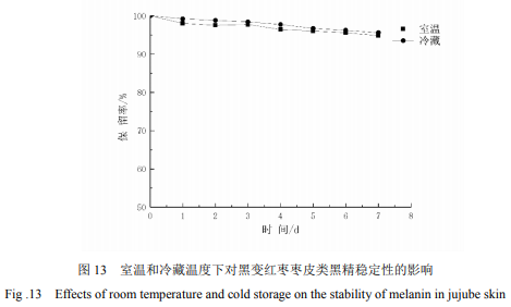 由圖13可以看出,在冷藏和室溫條件下,7天后其類黑精保留率分別為95.6%和94.8%,說明了較低溫度和冷藏條件下對黑變紅棗棗皮類黑精的穩(wěn)定性無明顯影響,但在經(jīng)過長時間的放置下黑變紅棗棗皮類黑精溶液都出現(xiàn)了些許沉淀。