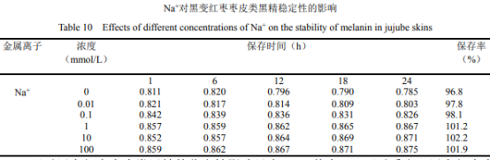Na+對黑變紅棗棗皮類黑精的穩(wěn)定性影響見表10,從表10可以看出,黑變紅棗棗皮類黑精對Na+具有良好的穩(wěn)定性,在低濃度(Na+<1mmol/L)時,黑變棗皮類黑精的吸光度隨著保存時間的延長是下降的,但下降的幅度不大,但當Na+濃度高于0.1mmol/L時,其類黑精的吸光度與保留率隨著保留時間的延長反而是有所上升的,綜合來看,Na+對黑變紅棗棗皮類黑精具有良好的穩(wěn)定性。在一定濃度范圍內有一定的增色作用。