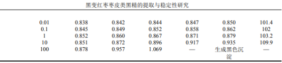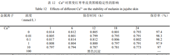 Ca2+對黑變紅棗棗皮類黑精的穩(wěn)定性影響見表12,從表17可以看出,當Ca2+濃度小于100mmol/L時,對黑變紅棗類黑精的穩(wěn)定性影響較小,但當Ca2+濃度大于100mmol/L時,溶液會生成黑色沉淀,綜合來看,低濃度Ca2+對黑變紅棗棗皮類黑精穩(wěn)定性較好。