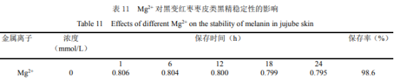 Mg2+對黑變紅棗棗皮類黑精的穩(wěn)定性影響見表12,從表12可以看出,在一定的濃度范圍內,隨著Mg2+濃度的增加與保存時間的不斷延長,黑變紅棗棗皮類黑精的吸光度也隨之增加,其增加的趨勢也越來越明顯,但是當Mg2+濃度大于10mmol/L時,隨著保存時間的不斷延長,類黑精溶液開始生成黑色沉淀,綜合來看,低濃度的Mg2+對黑變紅棗棗皮類黑精具有較好的穩(wěn)定性。