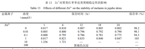 Zn2+對黑變紅棗棗皮類黑精的穩(wěn)定性影響見表13,從表13可以看出,當Zn2+濃度低于0.1mmol/L時,隨著保留時間的延長,黑變紅棗棗皮類黑鏡的穩(wěn)定性較好,類黑精吸光度與保留率有所降低,但當Zn2+濃度大于1mmol/L時,隨著保留時間的得延長類黑精的吸光度與保留率增加,隨著Zn2+濃度進一步增加開始生成黑色沉淀。綜合來看,低濃度的Zn2+對黑變棗皮類黑精有較好的穩(wěn)定性,高濃度時不穩(wěn)定。