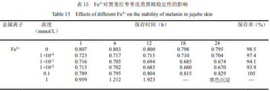 Fe3+對黑變紅棗棗皮類黑精的穩(wěn)定性影響見表15,從表15可以看出,當Fe3+濃度小于0.1mmol/L時,隨著Fe3+濃度的增加和保存時間的延長,黑變紅棗棗皮類黑精的吸光度和保留率是逐漸減小的,當Fe3+濃度大于0.1mmol/L時,隨著Fe3+濃度的增加與保留時間的延長其吸光度值迅速增大,并最終出現(xiàn)黑色沉淀,綜合來看,F(xiàn)e3+對黑變紅棗棗皮類黑精的穩(wěn)定性影響較大。