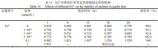 Fe2+對黑變紅棗棗皮類黑精的穩(wěn)定性影響見表14,從表14可以看出,當Fe2+濃度小于1×10-2mmol/L時,隨著Fe2+濃度的增加與保存時間的延長,黑變紅棗棗皮類黑精的吸光度和保留率曾下降趨勢,類黑精溶液顏色變淺,當Fe2+濃度達到1×10-2mmol/L后,隨著Fe2+濃度的增加與保存時間的延長其類黑精吸光度增加明顯,最終有黑色沉淀生成,綜合來看,F(xiàn)e2+對黑變紅棗棗皮類黑精的穩(wěn)定性影響較大。