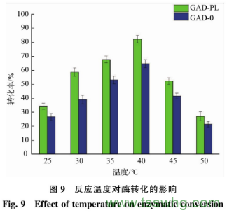 酶法制備GABA是一個不可逆反應(yīng),適宜的溫度可以使GABA轉(zhuǎn)化率達到最大,所以通過設(shè)置不同的酶轉(zhuǎn)化溫度來探究溫度對GABA轉(zhuǎn)化率的影響。以100g/L的谷氨酸為底物,溶于去離子水中,加入濕菌體(在55℃水浴鍋預(yù)處理50min,改善細胞膜的通透性)30U/g,在150r/min的水浴搖床中進行轉(zhuǎn)化,反應(yīng)過程中,控制pH為5.0。溫度梯度設(shè)置為25、30、35、40、45、50℃,反應(yīng)24h后終止反應(yīng)并進行煮沸處理,12000r/min離心5min得上清液,適當稀釋并過0.22μm有機濾膜后用HPLC-OPA柱前衍生法進行檢測,結(jié)果見圖9。轉(zhuǎn)化率隨溫度升高逐漸提高.當轉(zhuǎn)化溫度達到40℃時,GAD-0和GAD-PL轉(zhuǎn)化率達到最高,分別為64.78%和82.27%,繼續(xù)升高溫度,轉(zhuǎn)化率反而降低。這是因為枯草芽孢桿菌細胞壁厚,而反應(yīng)溫度過低時,底物與胞內(nèi)酶液無法充分接觸使得轉(zhuǎn)化率低:當反應(yīng)溫度過高時,酶與PLP穩(wěn)定性差,從而影響GABA的轉(zhuǎn)化率。