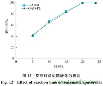 以100g/L的谷氨酸為底物,溶于去離子水中,加入預(yù)處理過的不同濕菌體,GAD-0和GAD-PL加入量分別為50U/g和40U/g,在40℃、150r/min的水浴搖床中反應(yīng)24h,反應(yīng)過程中,控制DH為5.0。反應(yīng)結(jié)束后進行煮沸處理,12000r/min離心5min得上清液,適當稀釋后用HPLC-OPA柱前衍生法進行檢測,結(jié)果見圖12。在0~20h,GAD-0和GAD-PL轉(zhuǎn)化合成GABA的產(chǎn)量隨時問延長迅速增加,在20h時轉(zhuǎn)化率達到100%,之后隨著反應(yīng)進行,轉(zhuǎn)化率不再發(fā)生變化。